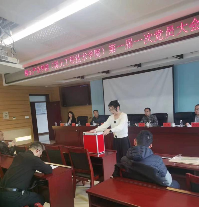 大会审议通过了公司党总支委员选举办法、委员候选人名单、监票人和计票人名单。按照选举规定和程序,以无记名投票、差额选举的方式,选举产生了稀土产业公司(稀土工程技术学院)第一届党总支委员,并进行了党总支委员会第一次全体会议,选举产生了党总支负责人。